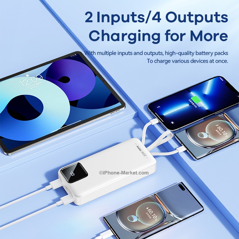 4 پورت خروجی: یو اس بی یک 22.5 وات و تایپ سی 22.5 وات / لایتنینگ 20 وات / یو اس بی دو 5 ولت 3 آمپر
