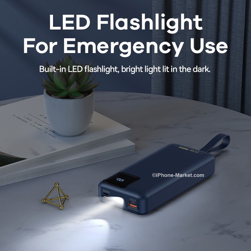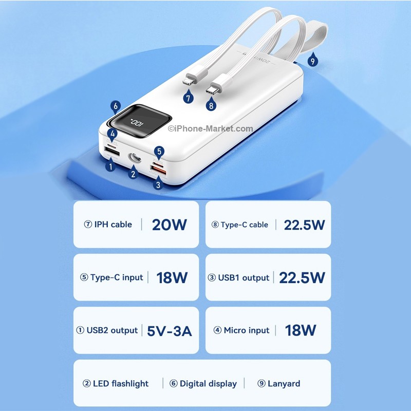 | خروجی | USB1: 4.5V 5.0A/5V 4.5A/5V 3A/9V 2A/12V 1.5A 22.5W Max - USB2: 5V 3A - TYPE-C Cable: 4.5V 5.0A/5V 4.5A/5V 3A/9V 2A/12V 1.5A 22.5W Max - Lightning Cable: 5V 2.4A/9V 2.22A/12V 1.67A 20W Max |