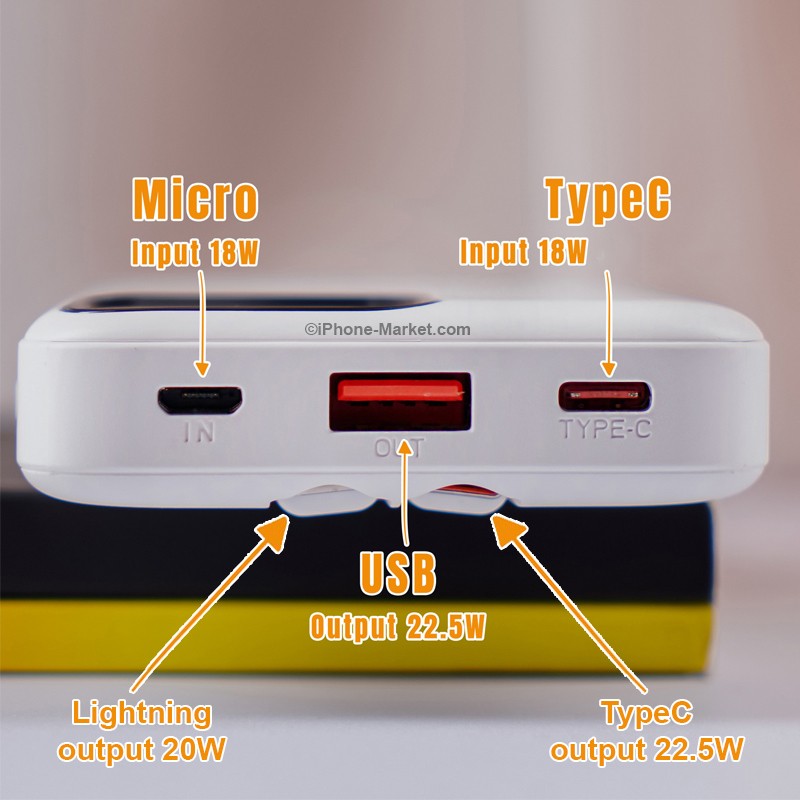 | خروجی | USB: 4.5V 5.0A/5V 4.5A/9V 2A/12V 1.5A 22.5W Max - TypeC Cable: 4.5V 5.0A/5V 4.5A/9V 2A/12V 1.5A 22.5W MAX - Lightning Cable: 9V 2.22A 20W MAX |