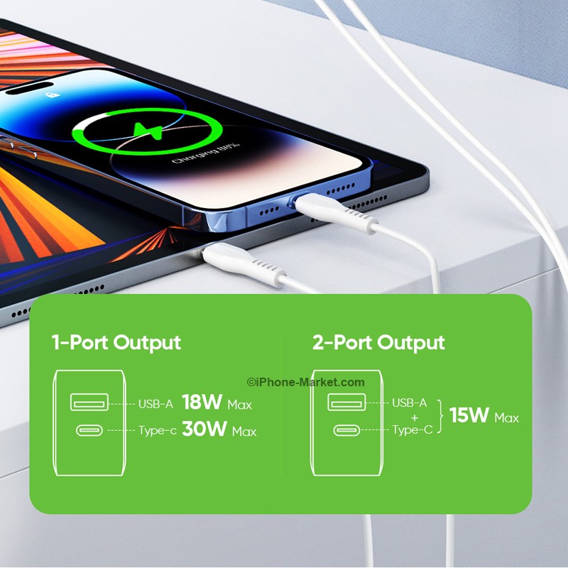 حداکثر توان خروجی پورت USB-C به تنهایی می تواند به 30 وات برسد و حداکثر توان خروجی پورت USB-A به تنهایی می تواند به 18 وات برسد
